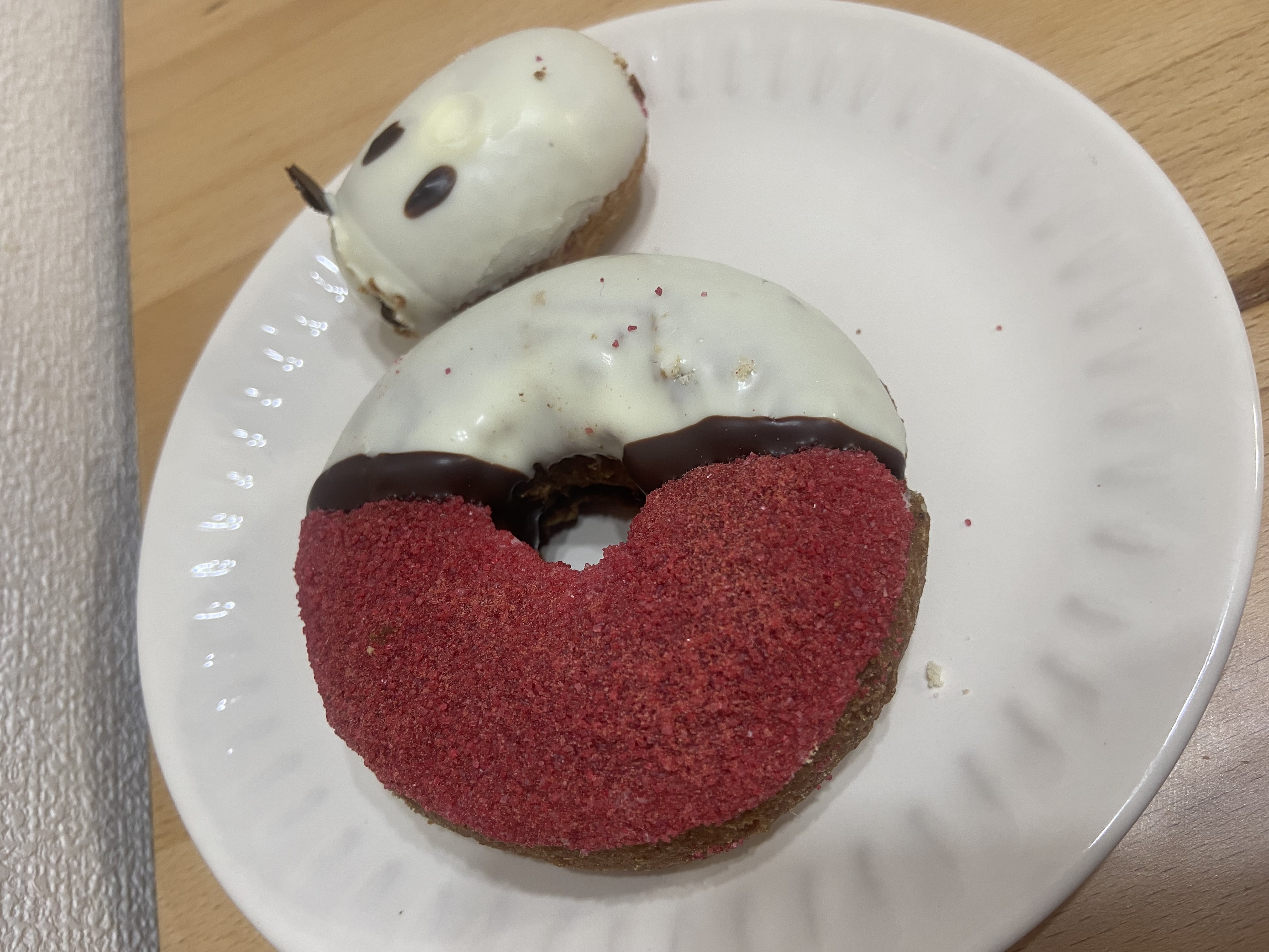 上のモンスターボール柄のドーナツですが、最初生地はオールドファッションのような割とクッキー感がある固めなのかな?