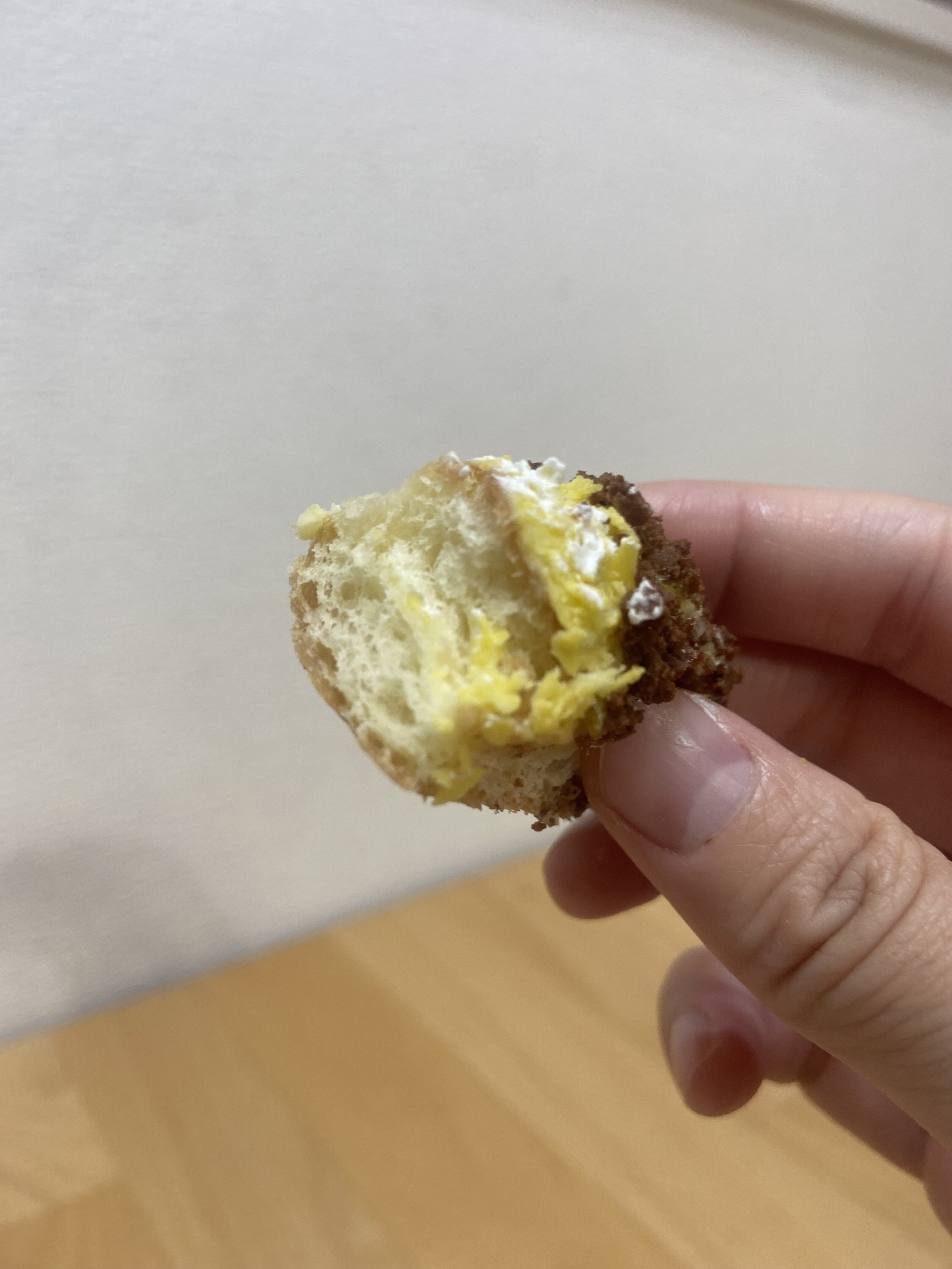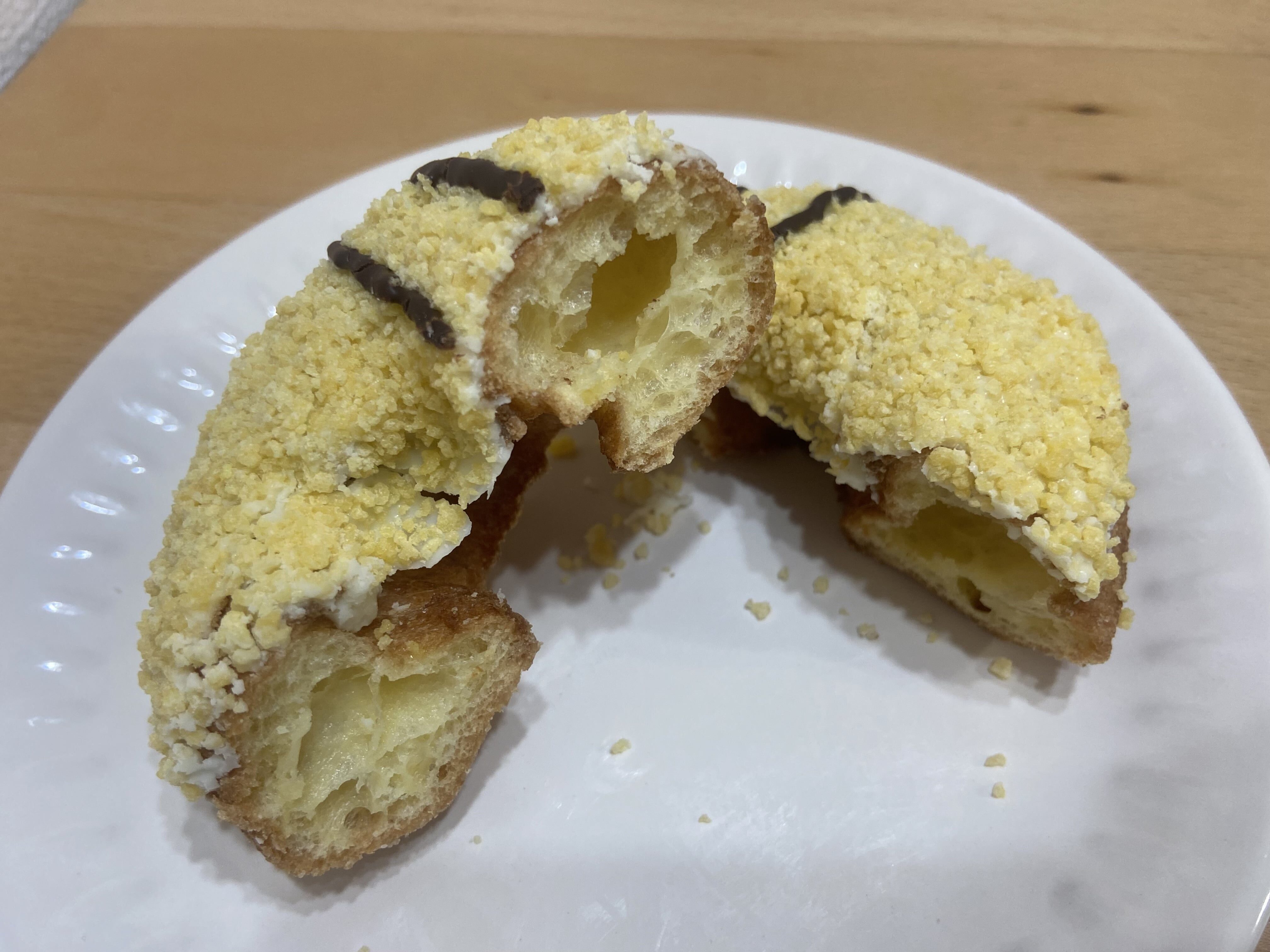 シュー生地は気泡が大きめでしっとりしており、ふわっと歯切れが良くて、噛むと上のカスタード風味のフレークと合わさってカリふわ食感が心地よいです。