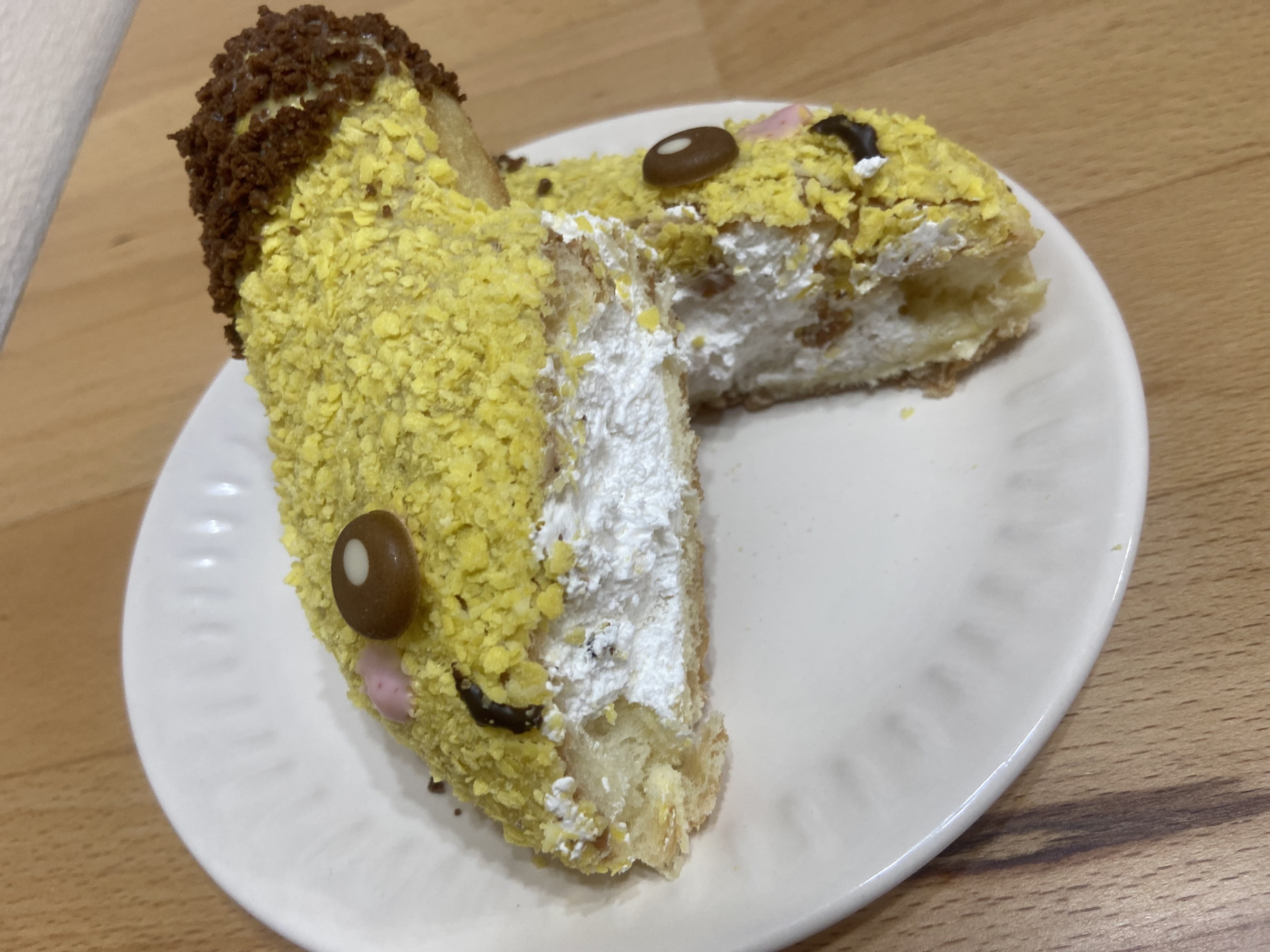 こちらもピカチュウのお顔と同様、コーティングがしっかりしていて生地とフレークの接着面はガリガリした食感になっていました。