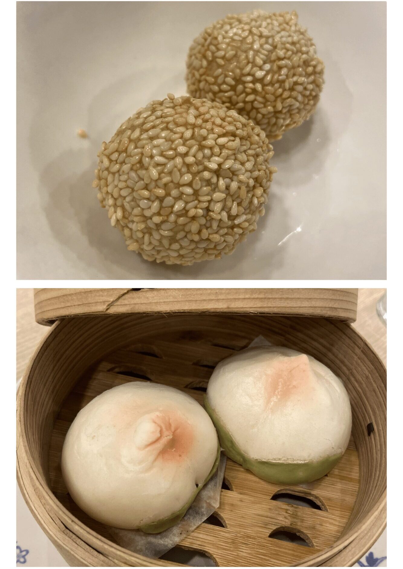 ふわっと軽い甘さの桃まん、外カリ・中もちの対比が楽しいごま団子——。