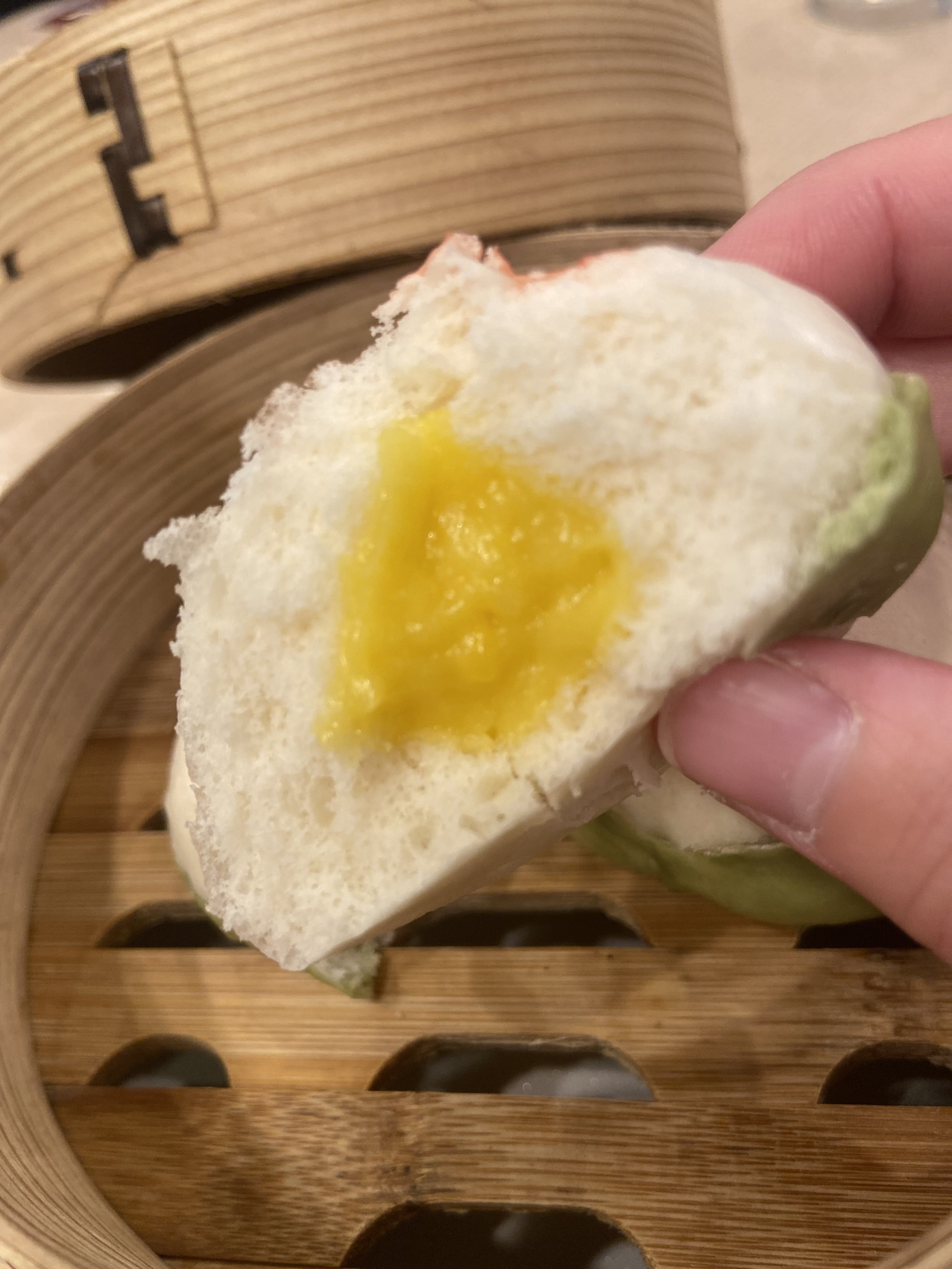 蒸篭で蒸したふわふわの生地に、とろりとしたカスタードクリームが包まれ、食後でも軽く食べられる上品な甘さが魅力です。