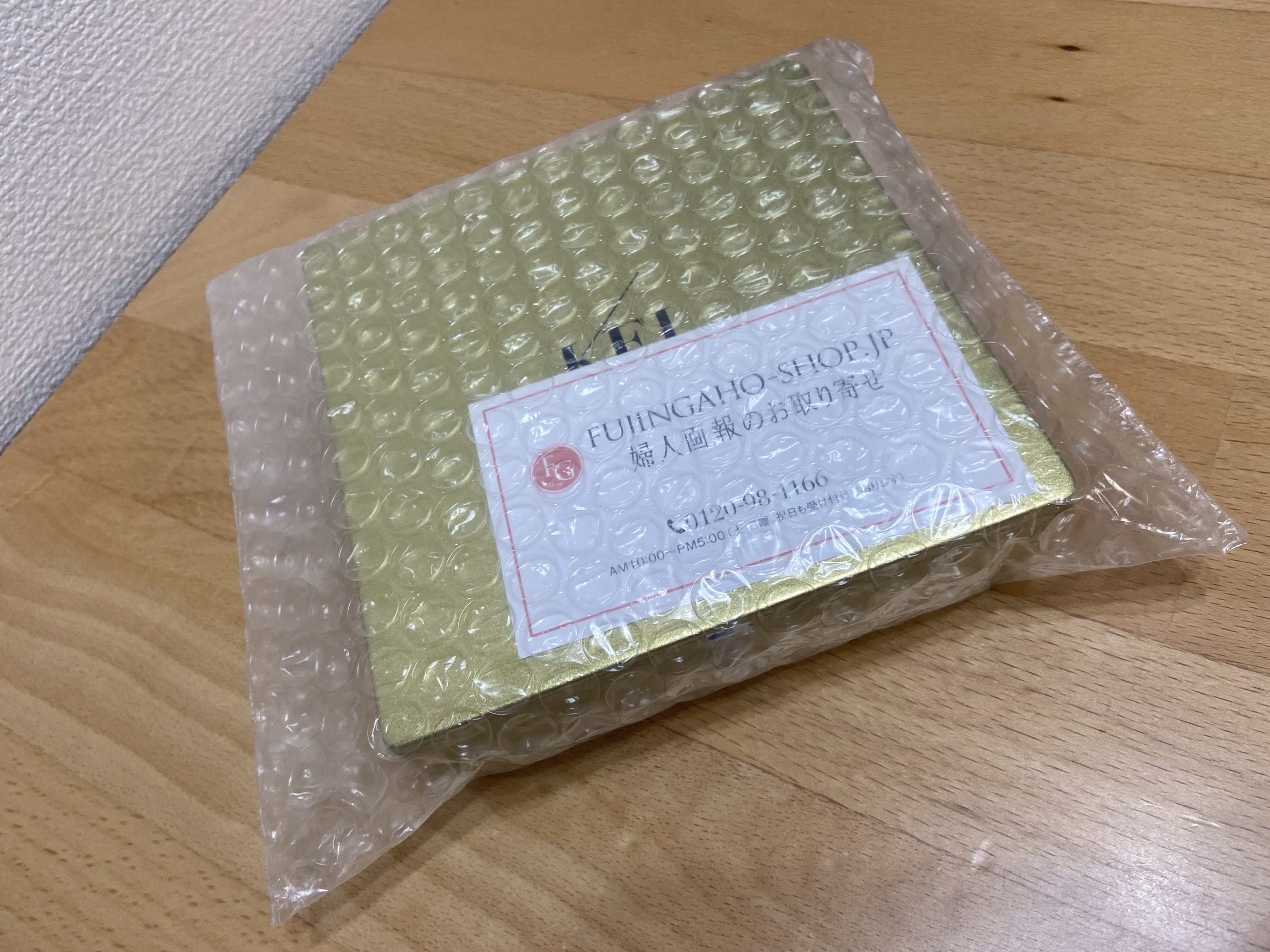 プチプチに梱包されて、金色の缶が見えています!
