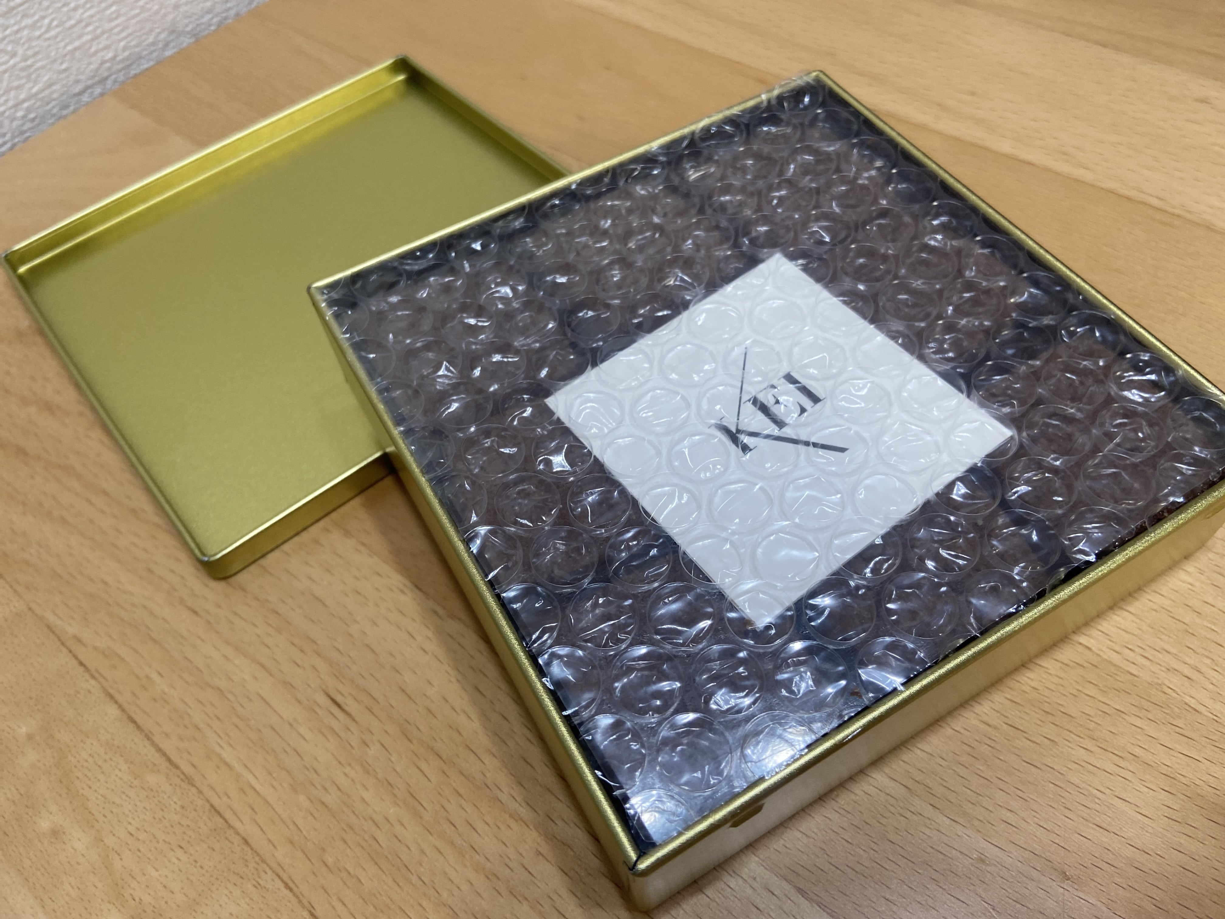 そんなビスキュイブルトンのクッキー缶は大きさとして縦横14.9㎝・高さ3.5㎝となっておりますが「サブレショコラ」を入れた缶は、縦横12.3㎝・高さ3.0㎝の少し小柄な缶で、たくさんのプチプチに梱包されて送られてきます。