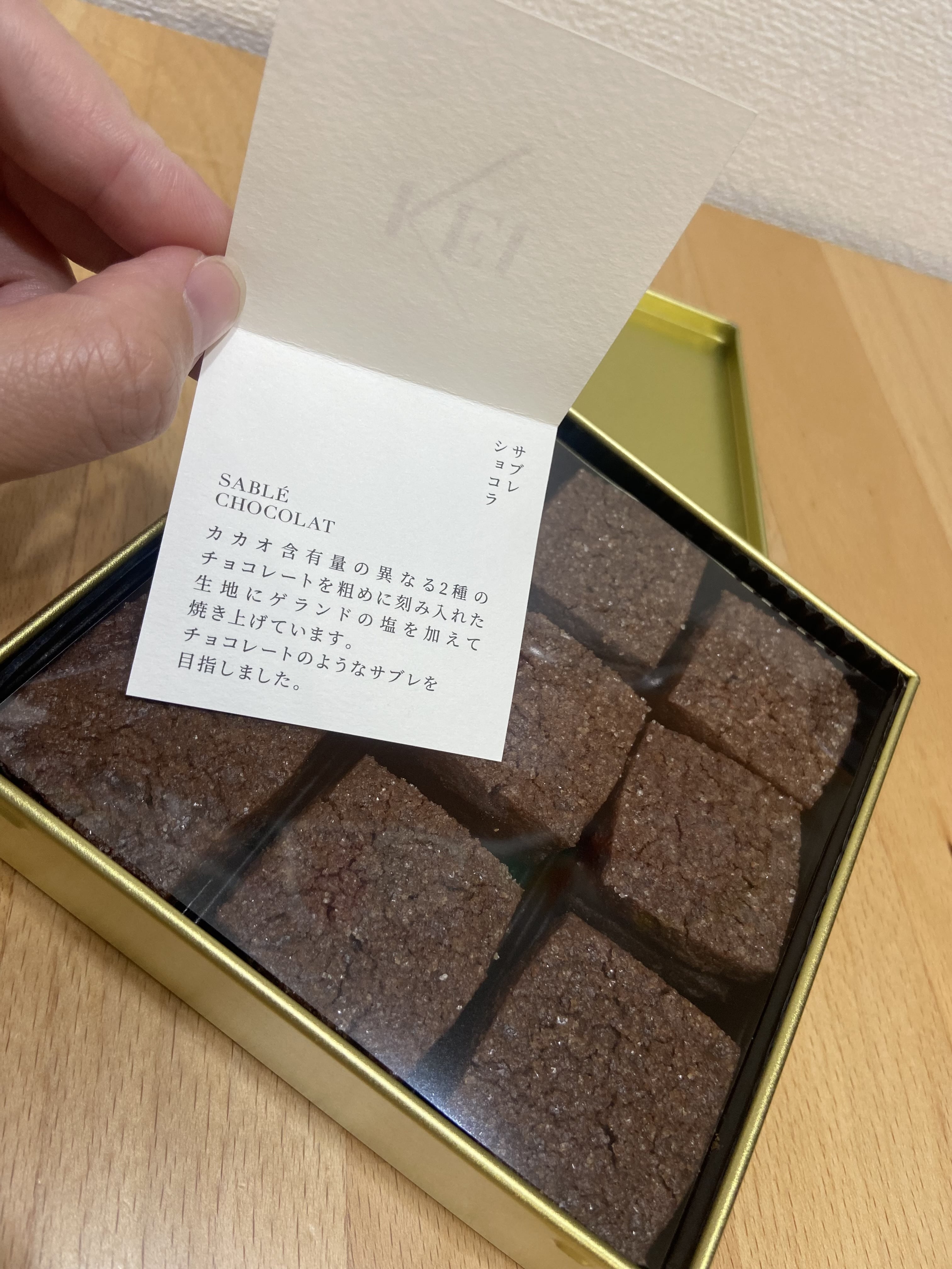 中には説明書きがあり「含有量の違う2種のチョコレートを粗めに刻み入れた生地にゲランドの塩を入れて焼き上げています。チョコレートのようなサブレを目指しました。」と書かれておりました。